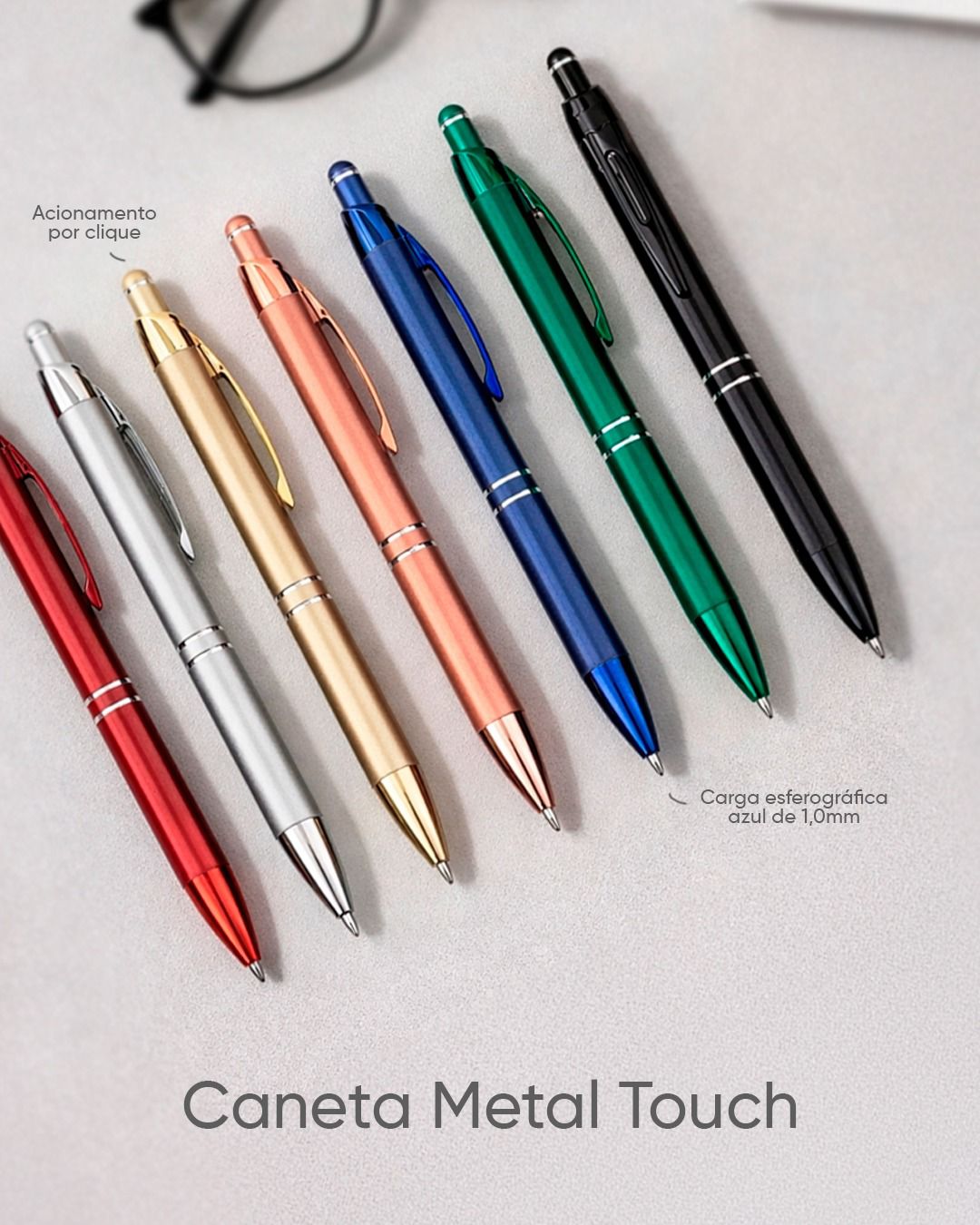 A Caneta Metálica Touch conta com detalhe emborrachado no topo que permite o uso em dispositivos com telas sensíveis ao toque, como celulares e tablets, agregando mais uma funcionalidade além da estrutura sob medida para garantir uma escrita mais estável e precisa.